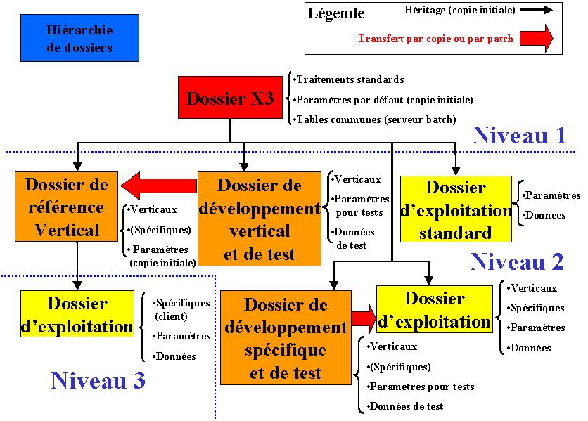 soit on désire avoir une approche verticale dans laquelle on autorise des spécifiques faits par le client. Il peut alors être intéressant de séparer les couches de développement en se créant un Dossier de développement vertical qui peut aussi servir de dossier de test. Ce dossier contient à la fois des développements verticaux, des paramètres dédiées et des données de test. Il peut être installé sur une machine dédiée, et va être copié à un moment donné sur le serveur d'exploitation, mais à un niveau intermédiaire : le dossier d'exploitation sera à un niveau inférieur et héritera de ce Dossier de référence vertical. Des transferts ultérieurs (lorsque le dossier de développement vertical évolue) sont possibles soit par copie (si les serveurs sont en ligne), soit par patch.